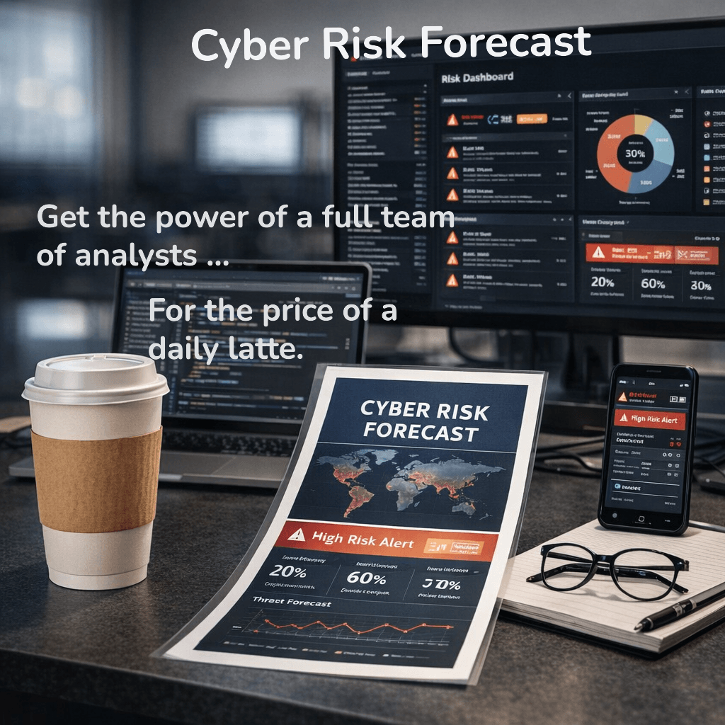 The Cyber Risk Forecast is ongoing support for your risk management efforts — providing clear analysis, updated forecasts, and industry‑specific guidance each month. For roughly the cost of a daily latte, you get deep insights into current and emerging risk along with actionable recommendations. Financial impacts are quantified, and all without adding headcount or buying into expensive systems. Get the support you need and deserve now.